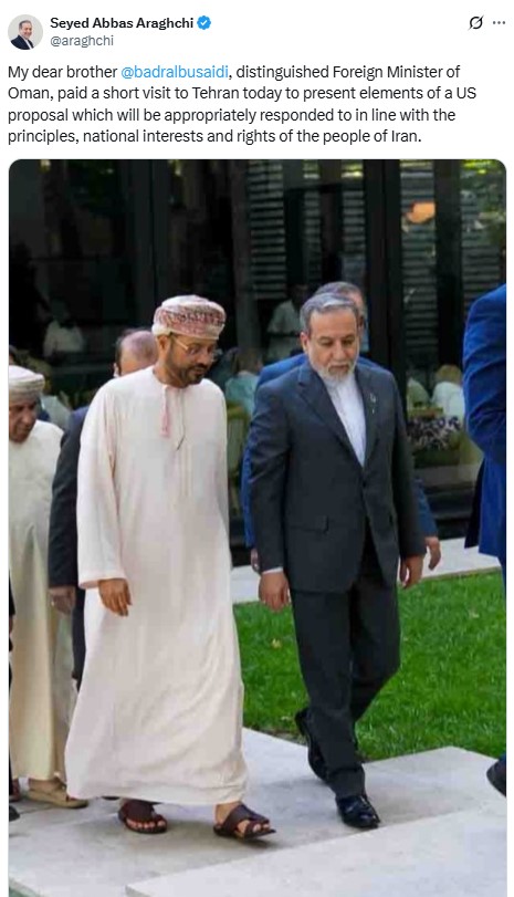 امروز عباس عراقچی، وزیر امور خارجهٔ جمهوری اسلامی، در شبکهٔ اجتماعی ایکس نوشت که بدر البوسعیدی، وزیر امور خارجی عمان، در سفری کوتاه به تهران مفاد پیشنهاد آمریکا برای توافق هستهیی را به ایران ارائه کرده است.