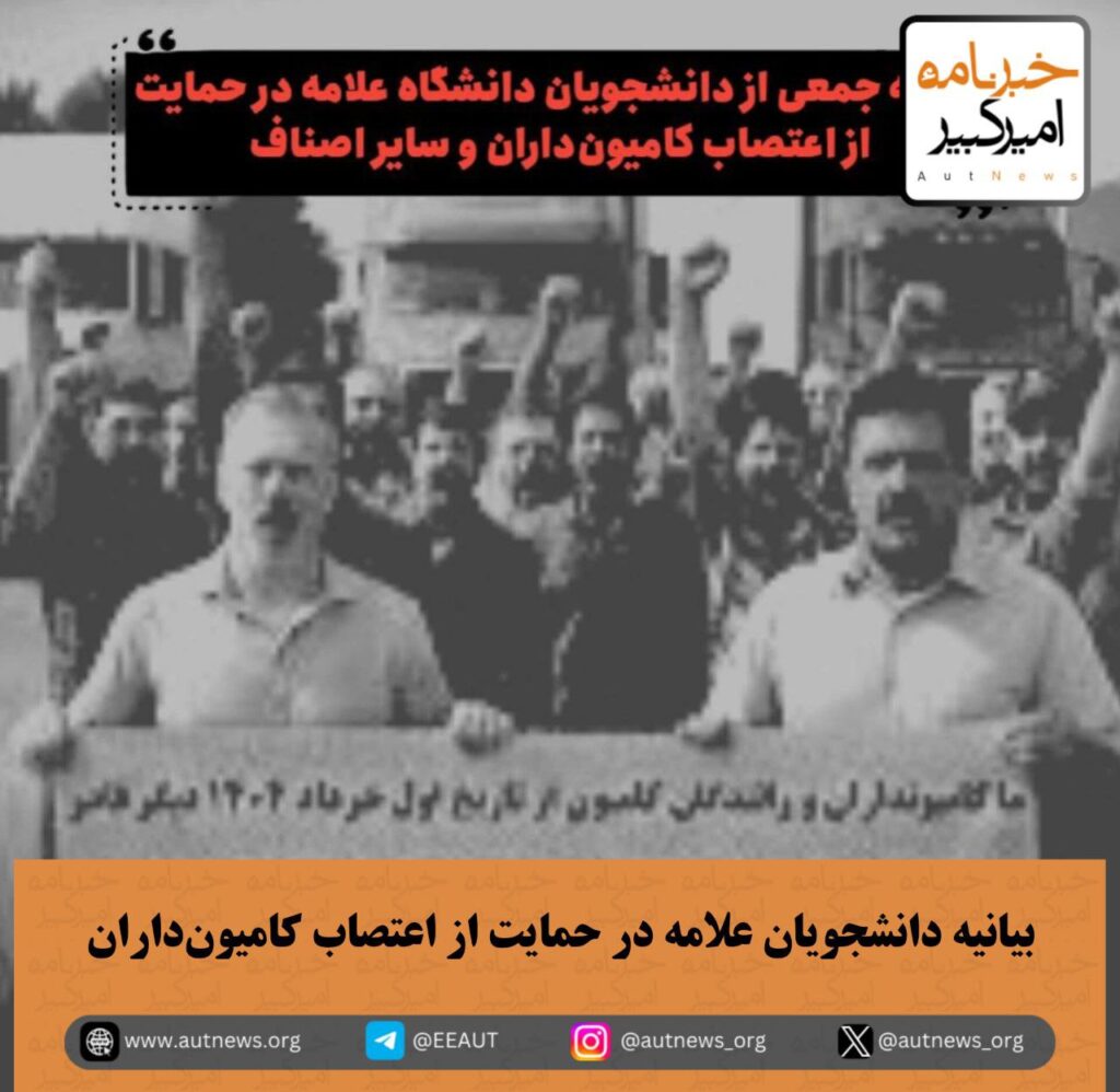 به گزارش خبرنامهٔ امیرکبیر، جمعی از دانشجویان دانشگاه علامه بیانیهای در حمایت از اعتصاب رانندگان و کامیونداران و دیگر اصناف منتشر کردند. متن این بیانیه چنین است: