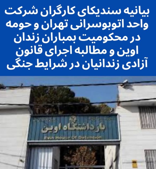 بیانیهٔ سندیکای کارگران شرکت واحد اتوبوسرانی تهران و حومه در محکومیت بمباران زندان اوین و مطالبهٔ اجرای قانون آزادی زندانیان در شرایط جنگی