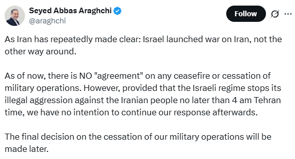 در حال حاضر، هیچ «توافقی» در مورد آتشبس یا توقف عملیات نظامی وجود ندارد. با این حال، به این شرط که رژیم اسرائیل تجاوز غیرقانونی علیه مردم ایران را حداکثر تا ساعت ۴ صبح به وقت تهران متوقف کند، ما قصد نداریم پس از آن به واکنش ادامه دهیم.
