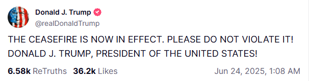 اندکی بعد، ترامپ در حساب کاربریاش در تروت سوشیال کوشید به بقیه اطمینانخاطر بدهد و نوشت که «اسرائیل قصد حمله به ایران ندارد. همهٔ هواپیماها برمیگردند و به خانه میروند.» او بار دیگر تأیید کرد که «آتشبس برقرار است.»
