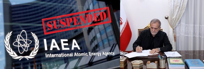 مسعود پزشکیان، رئیس جمهوری اسلامی ایران، چهارشنبه ۱۱ تیر اجرای قانون تعلیق همکاری با آژانس بینالمللی انرژی اتمی را به دولت ابلاغ کرد. این قانون روز چهارشنبه ۴ تیر در جلسهٔ علنی مجلس اسلامی تصویب شد و در همان روز به تأیید شورای نگهبان رسید.