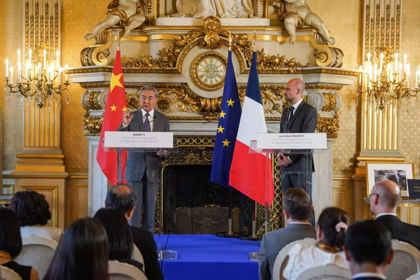 وزیر خارجهٔ چین در پایان گفت: «چین و فرانسه هر دو عضو دائم شورای امنیت سازمان ملل هستند و باید از انصاف و عدالت دفاع کنند، از گفتوگو برای حل درگیریها حمایت نمایند، با هرگونه استاندارد دوگانه مخالفت کنند، و مواضع و سیاستهایشان را بر اساس حقایق و عدالت تنظیم کنند. سازمان ملل و شورای امنیت آن نیز باید نقش خود را در تحقق صلح ایفا کنند. چین مایل است همراه با فرانسه در این راه تلاش بیوقفهای کند.»