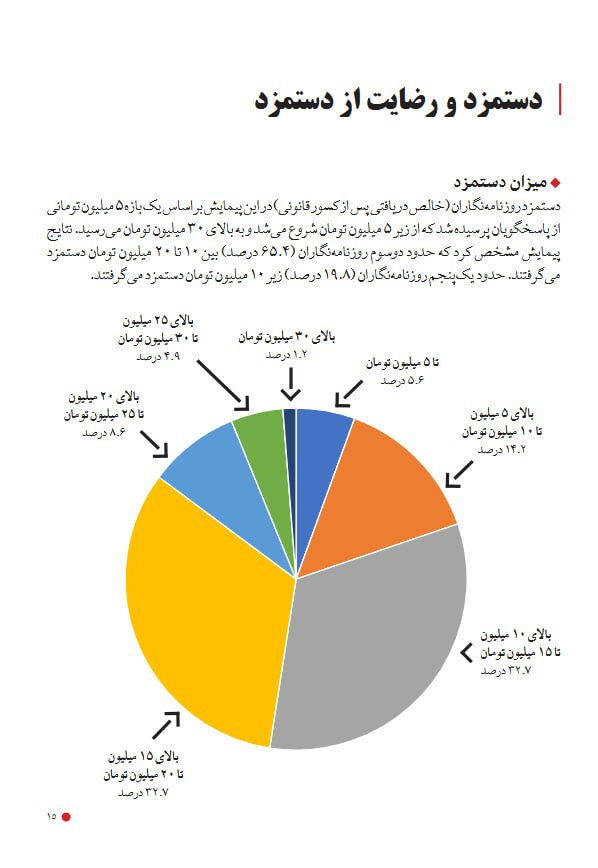 نکتهٔ شایان توجه دیگر آنکه هیچیک از پاسخدهندگان شاغل در رسانههای حکومتی کمتر از پنجمیلیون تومان یا بیش از ۳۰میلیون تومان مزد نمیگرفتند.