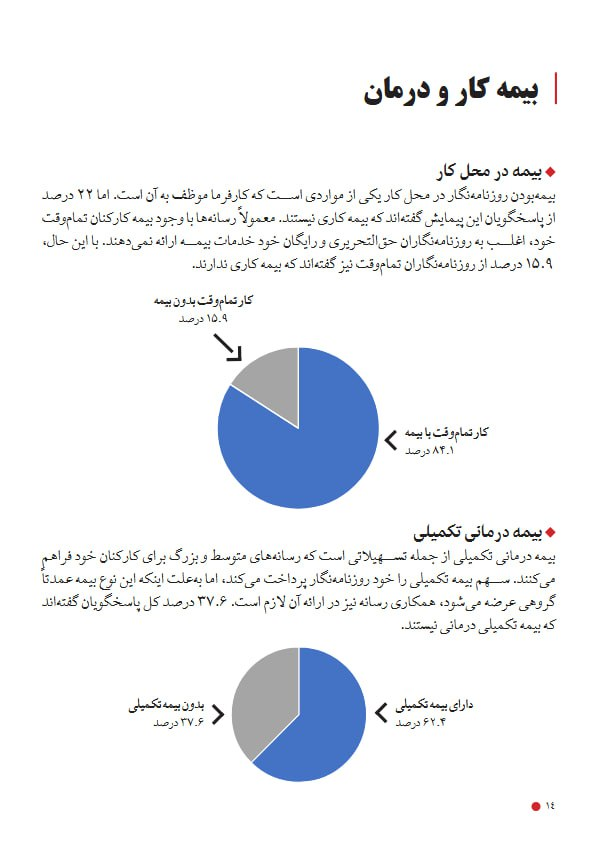 طبق دادههای پژوهشی انجمن صنفی روزنامهنگاران استان تهران، ۵٫۷درصد از روزنامهنگاران هیچ سابقهٔ بیمهای ندارند و ۴۸٫۴درصد کمتر از ۱۰ سال سابقه بیمه دارند. همچنین، ۲۲درصد از روزنامهنگاران هماکنون پوشش بیمهٔ کاری ندارند و ۱۵٫۹درصد از آنها تماموقت در رسانهها مشغول به کارند. همچنین، ۳۷٫۶درصد از روزنامهنگاران شرکتکننده در این پژوهش اعلام کردند که بیمهٔ تکمیلی درمان ندارند.
