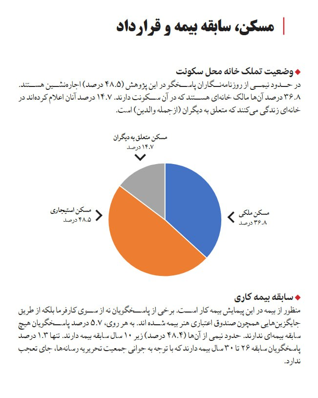 بر اساس دادههای این پیمایش، ۴۸٫۵درصد از روزنامهنگارانی که به پرسشنامه پاسخ دادند اجارهنشیناند و ۳۶٫۸ مالک خانهاند. همچنین، ۱۴٫۷درصد گفتهاند که در خانهٔ متعلق به دیگران (مثل پدر و مادر) زندگی میکنند.