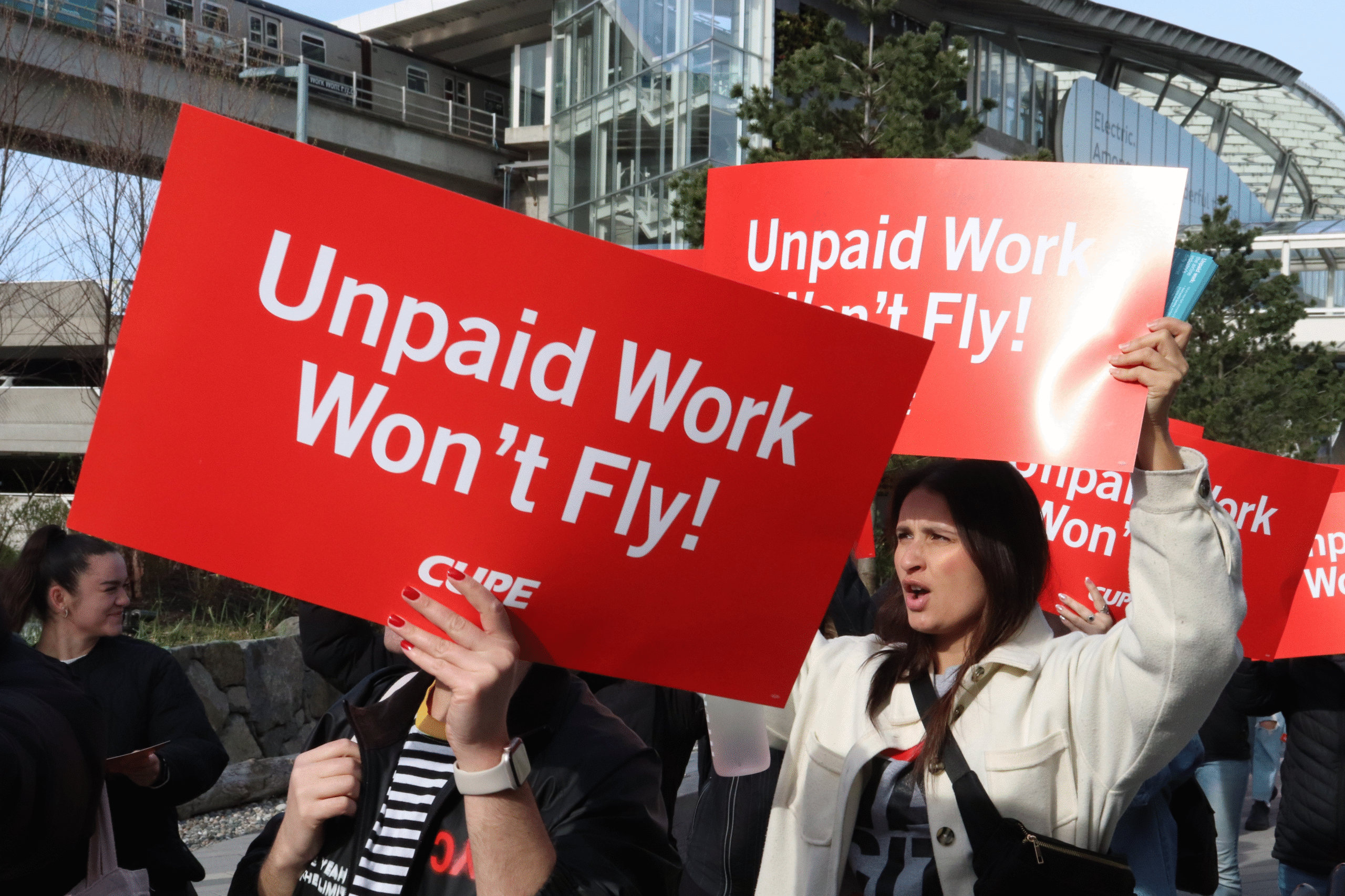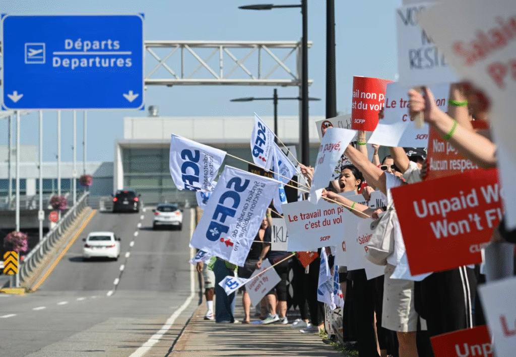 روز شنبه، مهمانداران شرکت هواپیمایی ایر کانادا در فرودگاههای اصلی کانادا تجمع اعتصابی برگزار کردند و پلاکاردهایی دربارهٔ خواستهایشان در دست گرفتند.