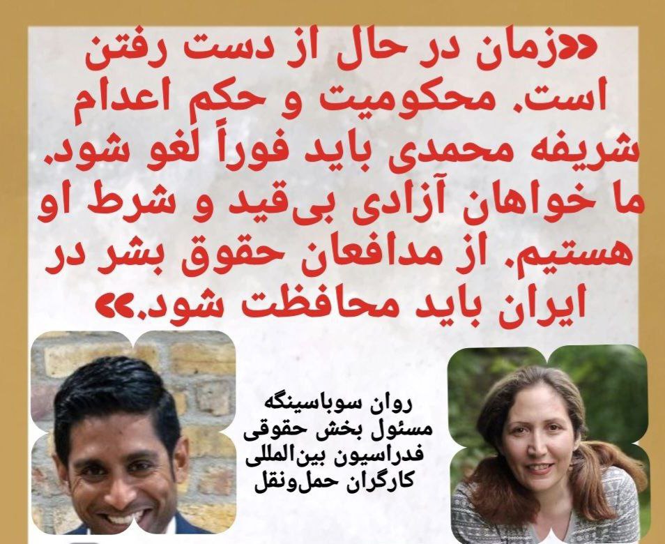 روان سوباسینگه، مسئول بخش حقوقی فدراسیون بینالمللی کارگران حملونقل (ITF)، با انتشار پیامی در شبکههای اجتماعی خواستار توقف فوری حکم اعدام و آزادی بیقیدوشرط “شریفه محمدی”، شد.