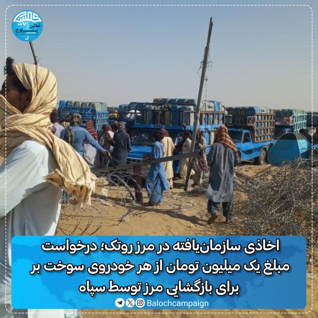 به گزارش کمپین فعالین بلوچ، سپاه پاسداران شرط بازگشایی گذر مرزی روتک به روی سوختبران را پرداخت یکمیلیون تومان به ازای هر خودرو سوختبر اعلام کرده است. این مبلغ قرار است با نام «همیاری» از هر خودرو سوختبر گرفته شود.