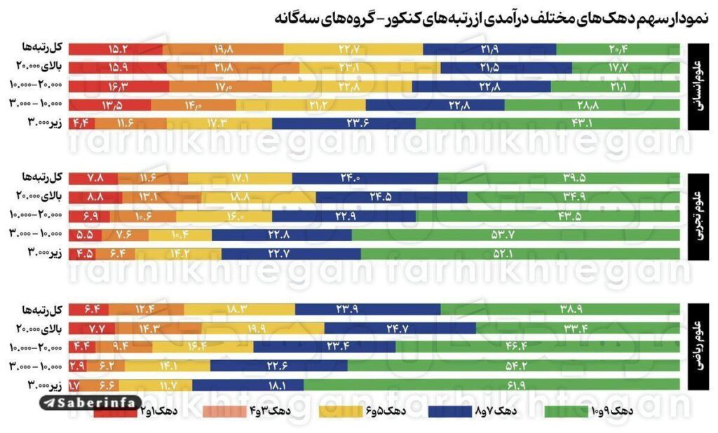 نمودار فوق بیانگر آن است که بهویژه در دو گروه آموزشی علوم تجربی و ریاضی، صاحبان درآمدهای بالا در دهکهای ۹ و ۱۰ اقتصادی بیشترین رتبههای زیر ۳۰۰۰ را به دست آوردەاند.