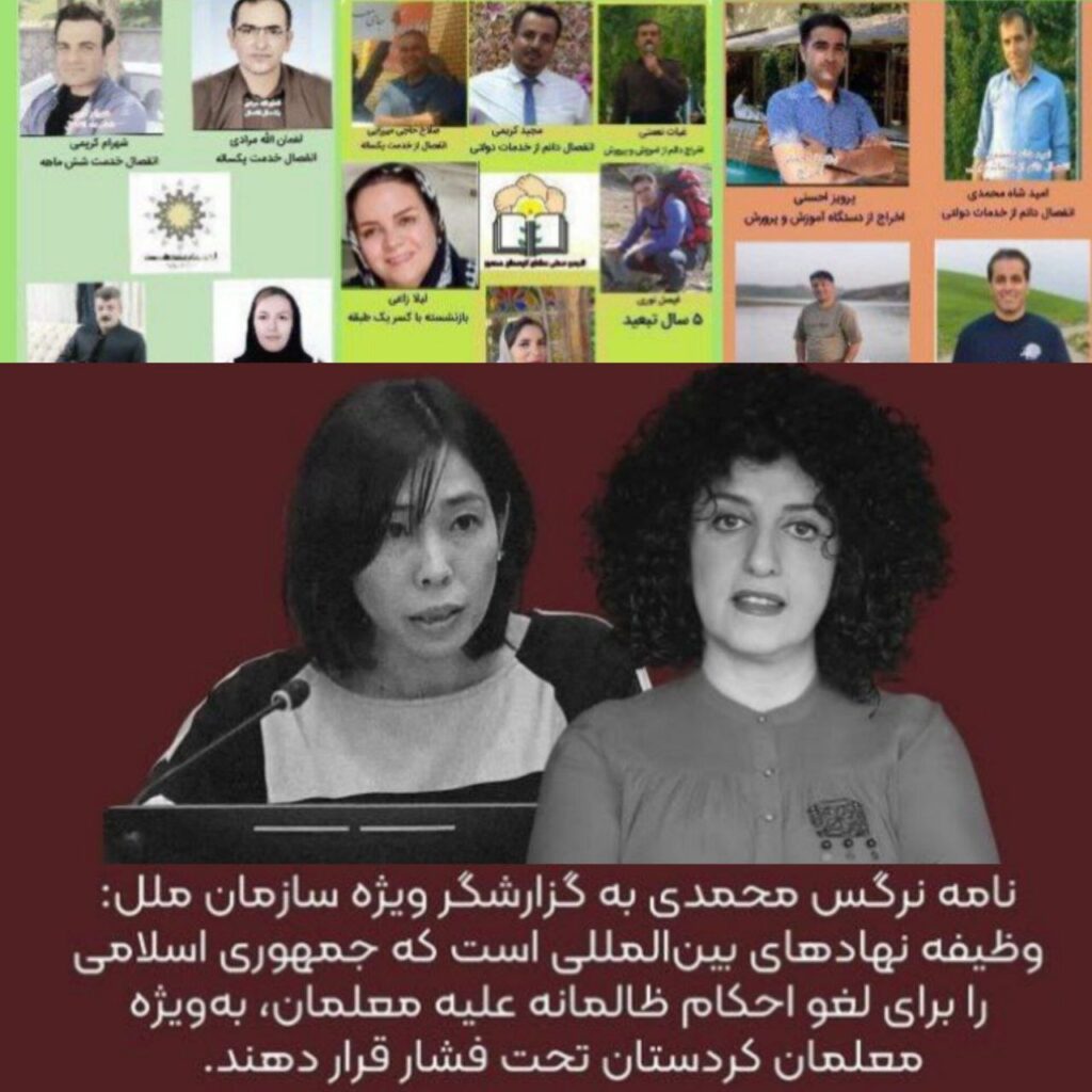 نرگس محمدی، فعال حقوق بشر و برندهٔ جایزه نوبل صلح، روز جمعه ۱۴ شهریور در یادداشتی در صفحهٔ اینستاگرام اعلام کرد که نامهای خطاب به مای ساتو، گزارشگر ویژهٔ حقوق بشر سازمان ملل متحد در امور ایران، نوشته است. در این نامه از سرکوب معلمان و فعالان صنفی در ایران، و بهویژه در کردستان، صحبت شده و این اقدام جمهوری اسلامی محکوم شده است.