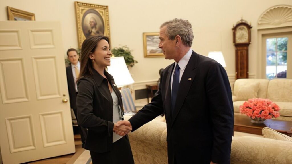 1310 President Bush: Meeting with the Executive Director of the Venezuelan Civil Society Group Sumate. Oval Office. resident George W. Bush met on May 31, 2005 with Maria Corina Machado, the Founder and Executive Director of Sumate. Sumate is an independent democratic civil society group in Venezuela. White House photo by Eric Draper