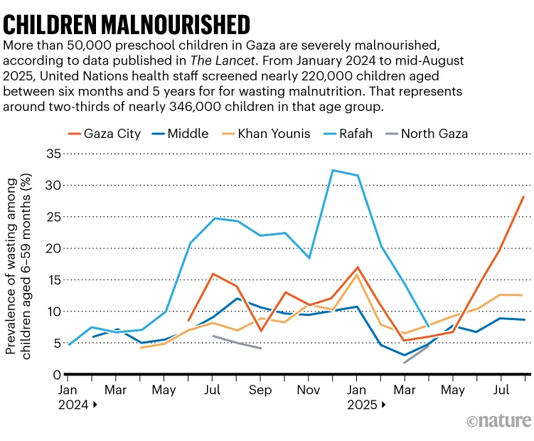 کمیتهٔ بررسی قحطی، که گروهی مستقل از کارشناسان است، پس از بررسیهایش به این نتیجه رسید که تا پایان ماه اوت [اوایل شهریور]، زمانی که محدودیتهای زیادی برای ارسال و تحویل کمکهای غذایی و دارویی به غزه وجود داشت، بیش از نیم میلیون نفر گرفتار قحطی بودند. بر اساس دادههای منتشر شده در نشریهٔ The Lancet در ۸ سپتامبر [۱۷ شهریور]، نزدیک به ۵۵,۰۰۰ کودک زیر پنج سال دچار سوءتغذیهٔ شدید بودند.