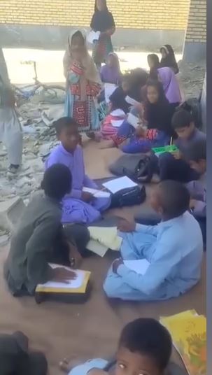 دهها دانشآموز مقطع ابتدایی در حیاط خاکی مدرسه و زیر آفتاب سوزان، بدون صندلی و نیمکت روی زمین نشستهاند و معلم در همان شرایط سخت، در حال تدریس است.