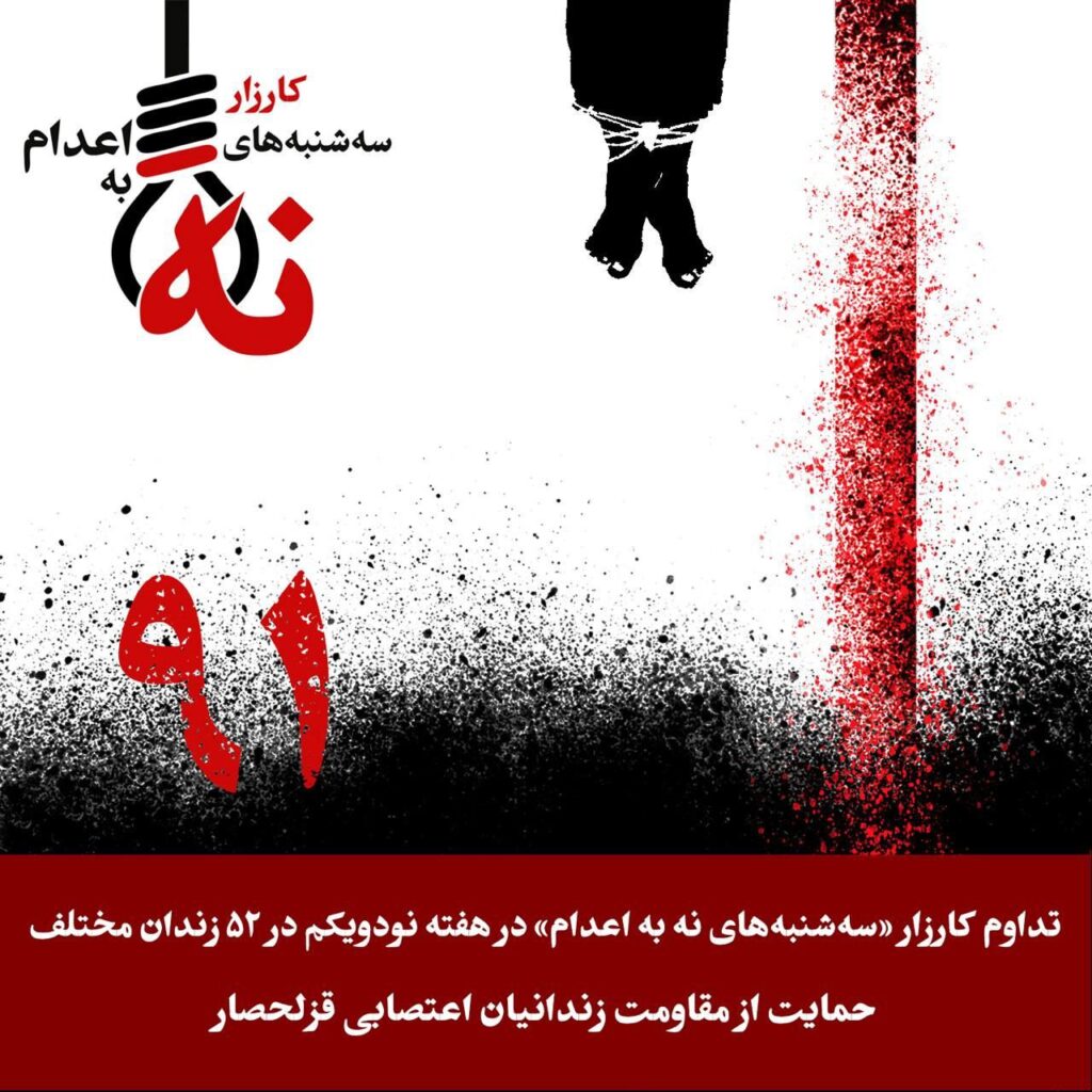 کارزار «سهشنبههای نه به اعدام» در حالی وارد نودویکمین هفته خود میشود که زندانیان واحد ۲ زندان قزلحصار پس از یک هفته اعتصاب غذا و با شعار «نه به اعدام» علیه اعدامهای گروهی و سرکوبهای حکومت ایستادگی کردند و توانستند شش تن از همبندیانشان را که برای اعدام به انفرادی برده بودند به بند بازگردانند؛ این اعتصاب گسترده برای هر کدام از آنها در واقع رفتن به استقبال مرگ بود؛ و اجرای احکام این حکومت قرون وسطایی میتوانست اجرای حکم هر کدام از آنها را، به دلیل مقاومتشان، سرعت ببخشد.