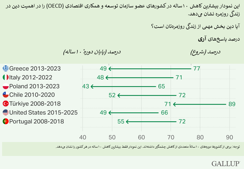 فقط تعداد کمی از کشورهای عمدتاً ثروتمند با کاهشهای بزرگتری در دینداری داشتهاند، از جمله یونان از ۲۰۱۳ تا ۲۰۲۳ (۲۸درصد)، ایتالیا از ۲۰۱۲ تا ۲۰۲۲ (۲۳درصد)، و لهستان از ۲۰۱۳ تا ۲۰۲۳ (۲۲درصد). در کشورهای دیگر، از جمله شیلی، ترکیه، و پرتغال، کاهشهایی مشابه کاهش دینداری در آمریکا دیده شده است.