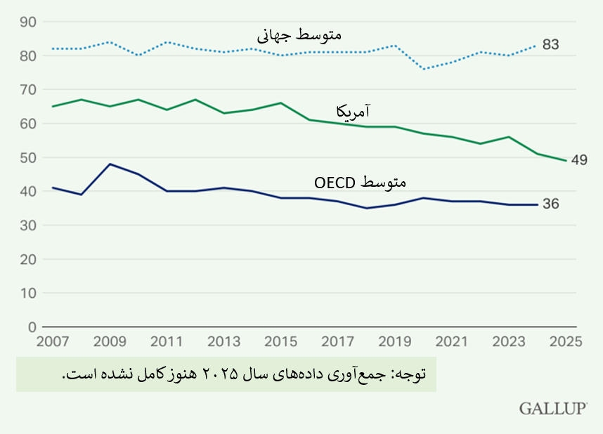 در عین حال، نگرش به دین در آمریکا به نگرش به دین در اقتصادهای پیشرفتهٔ دیگر نزدیکتر میشوند. در میان ۳۸ کشور سازمان توسعه و همکاری اقتصادی (OECD) در سال ۲۰۲۴، متوسط ۳۶٪ از بزرگسالان گفتهاند که دین برای زندگی روزمرهشان اهمیت دارد. فاصلهٔ بین آمریکا و متوسط این کشورها اکنون کمتر از هر زمان دیگری در نظرسنجیهای گالوپ است.