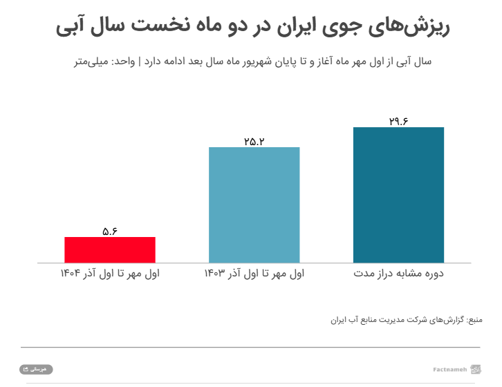 بر اساس دادههای شرکت مدیریت منابع آب ایران وابسته به وزارت نیرو، از ابتدای سال آبی جاری تا اول آذر ۱۴۰۴ ارتفاع کل ریزشهای جوّی در ایران فقط ۵٫۶ میلیمتر بوده است. این میزان بارش در مقایسه با مدت مشابه سال آبی گذشته ۷۸درصد کاهش نشان میدهد.