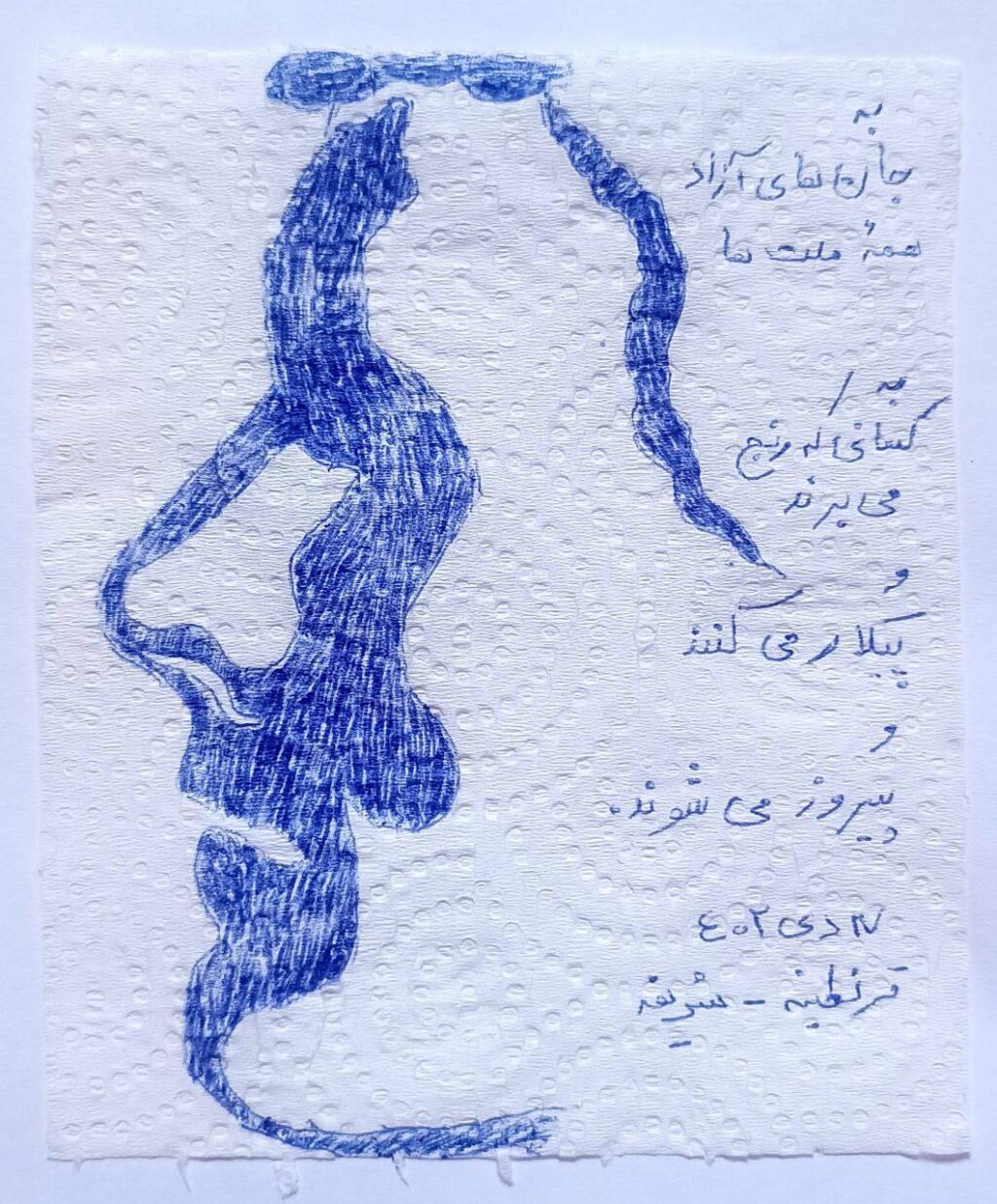 دستمال را نگاه کردم. قلبم در صدم ثانیه فشرده شد. خیلی احساس عجیبی بود. آن روزها حکم اعدام #شریفه آمده بود و همه شوکه و ناراحت بودیم و حالا دستمال کاغذی که با خودکار آبی رویش نقاشی و نوشته شده بود از شریفه در دستانم بود.