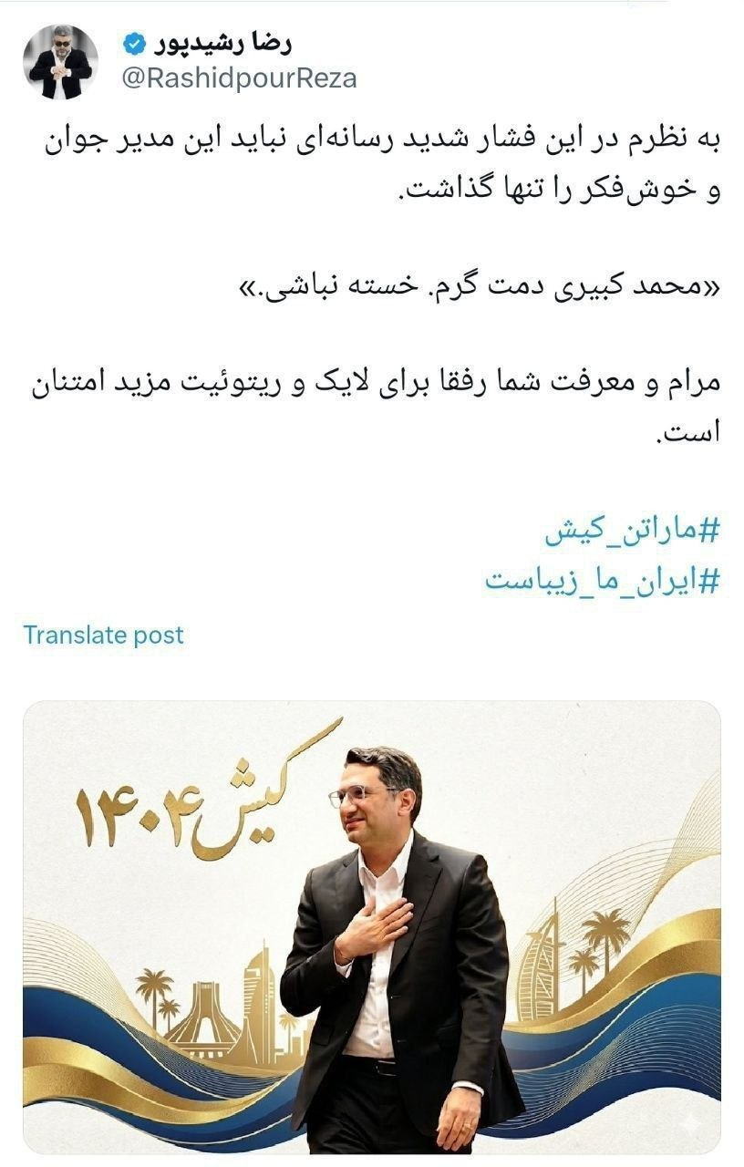 در همین حال، در شبکههای اجتماعی پیامهایی در حمایت از محمد کبیری، مدیر منطقهٔ کیش آزاد، منتشر شد.