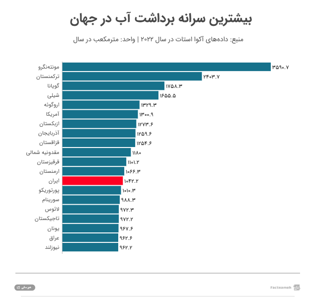 بر اساس دادههای آکوا استات وابسته به فائو (سازمان غذا و کشاورزی ملل متحد) در سال ۲۰۲۲ ، ایران با سرانهٔ برداشت آب ۱,۰۴۲ مترمکعب در ردهٔ سیزدهم بیشترین میزان برداشت آب در جهان ایستاد.