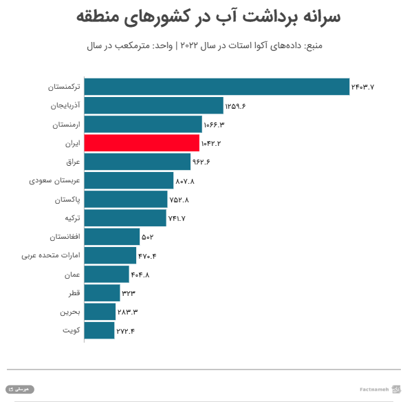 ایران در میان این ۱۵ کشور منطقه و همسایه، پس از سه کشور ترکمنستان و آذربایجان و ارمنستان بیشترین سرانهٔ برداشت آب را دارد.