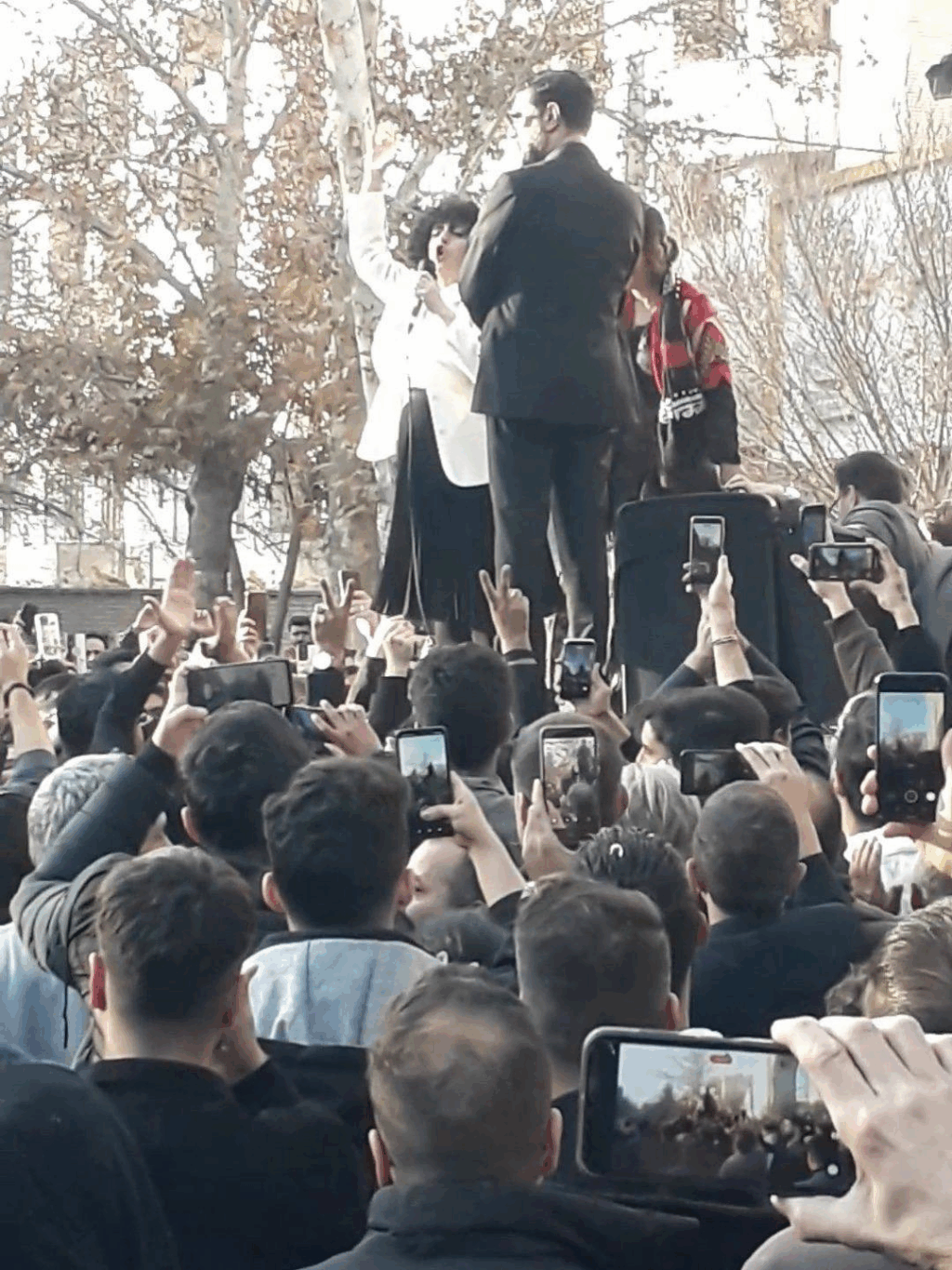 خانم نرگس محمدی در کنار سپیده قلیان در حال صحبت کردن در مراسم هفت زندهیاد خسرو علیکردی، مشهد، جمعه ۲۱ آذر ۱۴۰۴ (تصویر افزودهٔ اندیشهٔ نو است.)