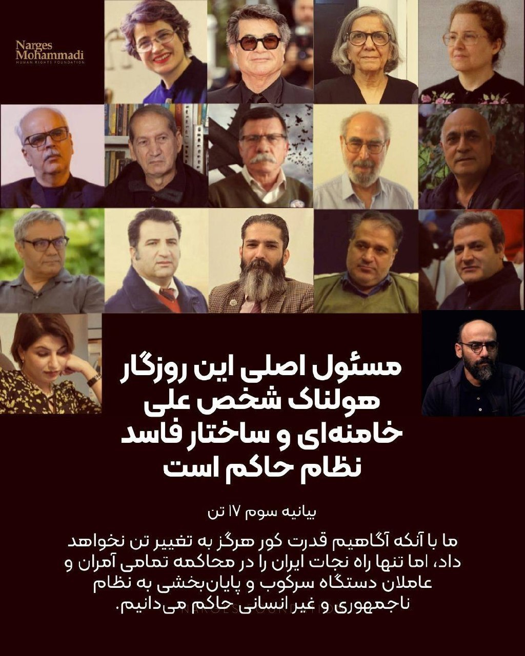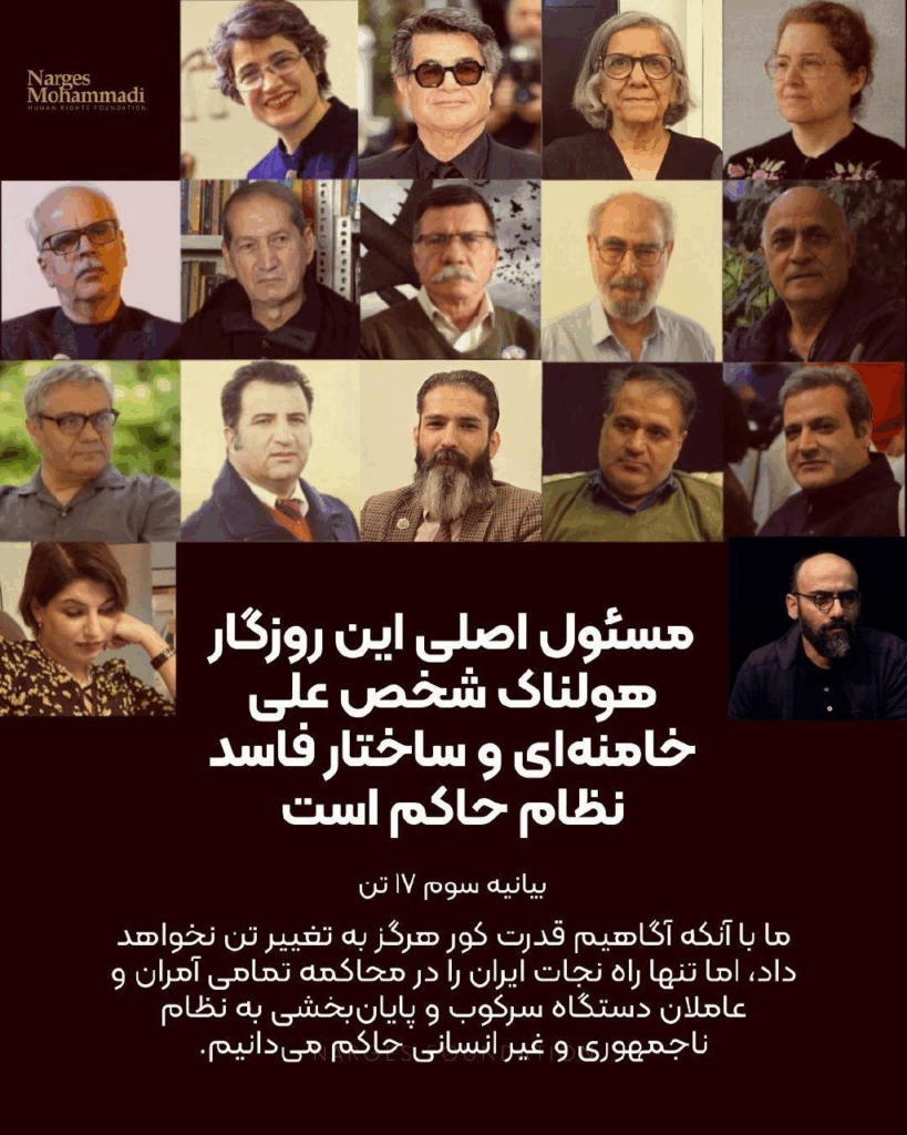 مسئول اصلی این روزگار هولناک شخص رهبر جمهوری اسلامی و ساختار سرکوبگر نظام حاکم است، ساختار خودکامهای که برای بقا از کُشته پُشته ساخت، بیاعتنا به اینکه خواست شهروندان، حتی برای تغییر نظام سیاسی، از حقوق اساسی و بدیهی ملت است و حکومت حق ندارد با انگهای رسوایی چون «فتنهگر، اغتشاشگر، و تخریبگر»، یا «تروریست و وابسته به دشمن» حق بنیادین تعیین سرنوشت را از مردم سلب کند.