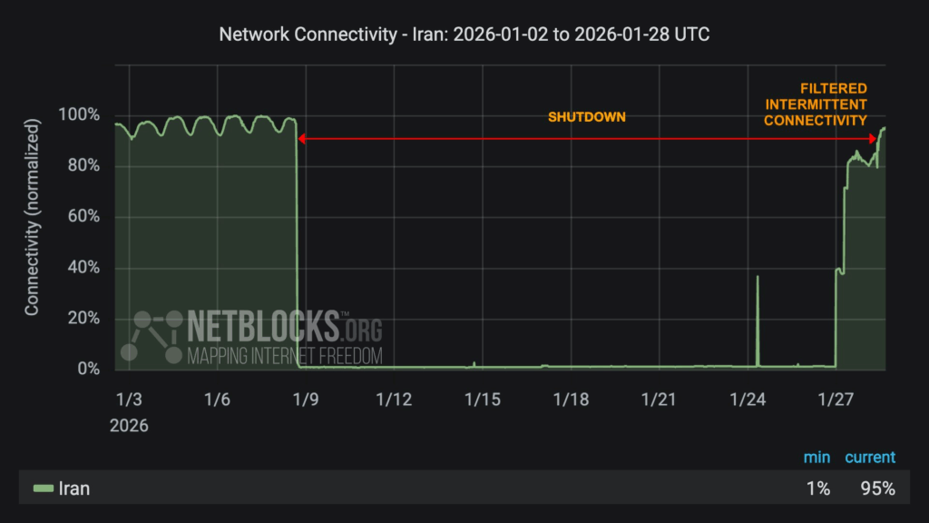 امید مجد – اندیشهٔ نو: نتبلاکس (NetBlocks)، از ناظران وضع اینترنت در کشورهای جهان، وضع اینترنت بینالمللی در ایران را روز چهارشنبه ۲۸ ژانویه ۲۰۲۶ (۸ بهمن ۱۴۰۴) بهروز کرد. به گزارش نتبلاکس، پس از ۲۰ روز کامل که از قطع عمدی سراسری اینترنت در جمهوری اسلامی ایران میگذرد (از ۸ ژانویه ۲۰۲۶)، روز چهارشنبه بیشتر کاربران عادی همچنان با فیلترینگ بسیار اساسی، خدمات ناپایدار، و سیستم فهرست سفید (white List) مواجهاند.