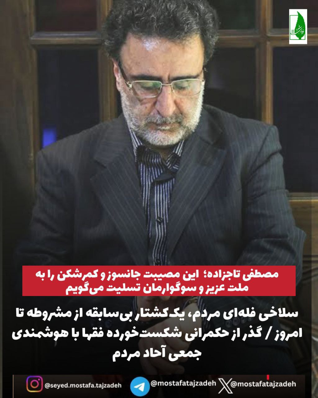 من ضمن محکوم کردن این سلاخی فلهیی و شریک دانستن خود در غم یکیک خانوادههای داغدار و مظلوم، این مصیبت جانسوز و کمرشکن را به ملت عزیز و سوگوارمان تسلیت میگویم و بر این باورم که ایران همچنان آبستن تحولات بزرگی است.