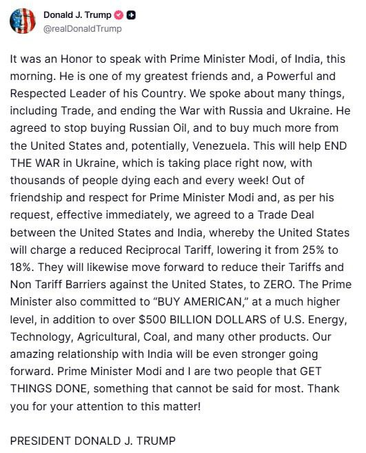 نارندرا مودی اعلام کرد که کاهش تعرفههای گمرکی «فرصتی تازه برای تقویت صادرات و حمایت از تولید ساخت هند» فراهم میکند. مودی در یادداشتی در شبکهٔ اجتماعی ایکس نوشت: ««خوشحالم که امروز با دوست عزیزم رئیسجمهور ترامپ صحبت میکنم. خوشحالم که محصولات ساخت هند اکنون تعرفهٔ کاهشیافتهٔ ۱۸درصدی خواهند داشت. تشکر فراوان از رئیسجمهور ترامپ به نمایندگی از ۱٫۴میلیارد مردم هند برای اعلام این توافق فوقالعاده.»