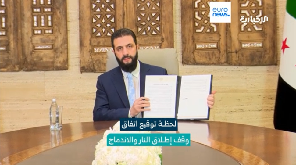 پس از بیانیهٔ مشترک فرانسه، آلمان، بریتانیا، و آمریکا که بر لزوم توقف خصومتها و برقراری آتشبس بلندمدت تأکید داشت، سرانجام نشستی در ۲۷ ژانویه با حضور مظلوم عبدی، فرمانده کل نیروهای دموکراتیک سوریه، و الهام احمد، رئیس مشترک روابط خارجی از یک سو، و اسعد شیبانی، وزیر خارجهٔ دولت موقت سوریه، از سوی دیگر تشکیل شد.