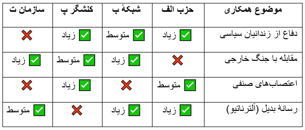 یعنی ممکن است دو نیرو در آیندهٔ سیاسی ایران کاملاً مخالف یکدیگر باشند، اما در دفاع از زندانیان سیاسی یا مقابله با سرکوب بتوانند تا حدّی همراستا عمل کنند. برای مثال، به ماتریس بسیار ساده و ابتدایی همکاریها نگاه کنید: