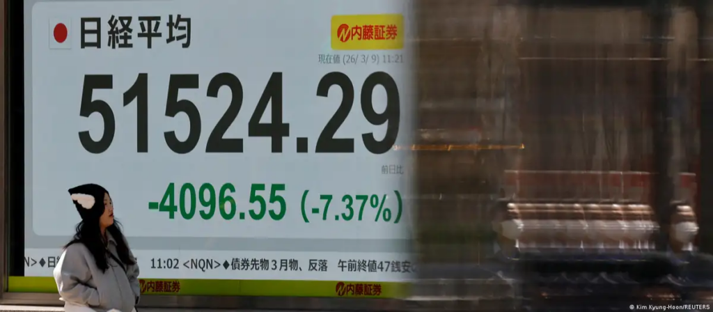در توکیو، پایتخت ژاپن، شاخص سهام نیکی ۲۲۵ در روز ۹ مارس (۱۸ اسفند) در معاملات صبح تا ۷درصد سقوط کرد.