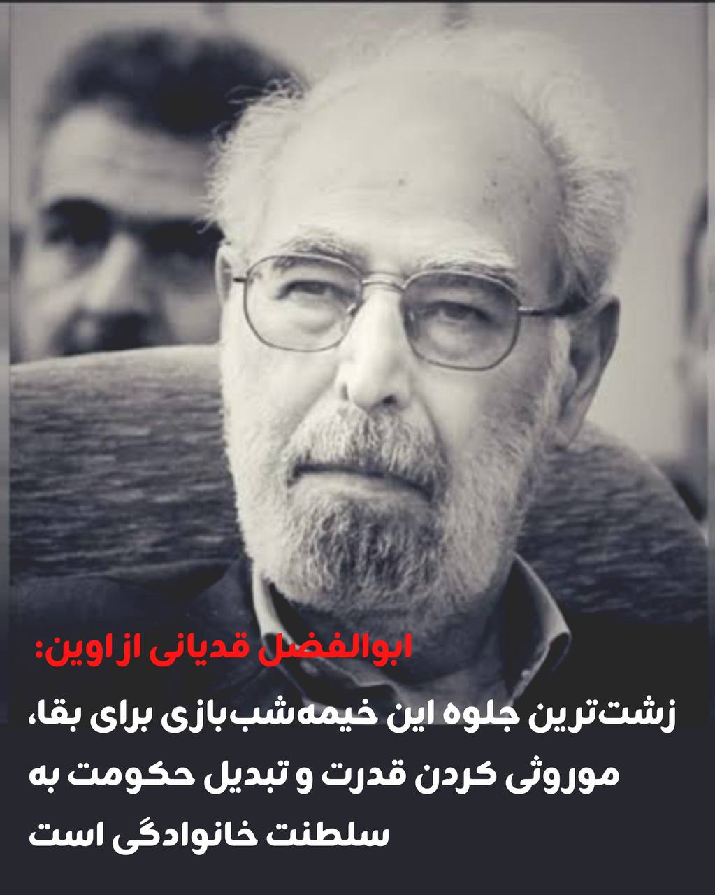 زشتترین جلوهٔ این خیمهشببازی برای بقا موروثی کردن قدرت و تبدیل کردن حکومت به سلطنت خانوادگی است، روندی که با توطئه و دسیسه، سرکوب مستمر، و ایجاد خفقان توسط علی خامنهای، خودکامه و خونریز ایران، پایهگذاری شد.