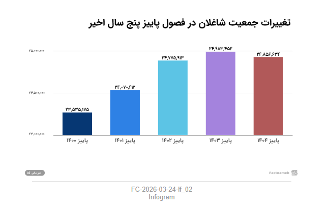 گزارش مرکز آمار از وضع بازار کار ایران در پاییز ۱۴۰۴ هم نشان میداد که جمعیت شاغلان نسبت به پاییز سال ۱۴۰۳ نزدیک به ۱۲۷هزار نفر کاهش یافته بود. مقایسهٔ تعداد شاغلان در پاییز پارسال در مقایسه با بهار نیز بیانگر کاهش نزدیک به ۲۶۶هزار نفری تعداد شاغلان است. بخشی از این کاهش البته به نوسانهای فصلی و ماهیت فصلی برخی مشاغل بهویژه شغلهای مربوط به بخش کشاورزی بازمیگردد، اما در کل نشانهای از روند کاهشی اشتغال در ۹ ماه نخست سال ۱۴۰۴ است.