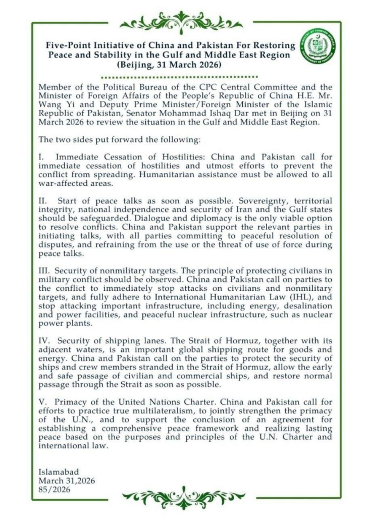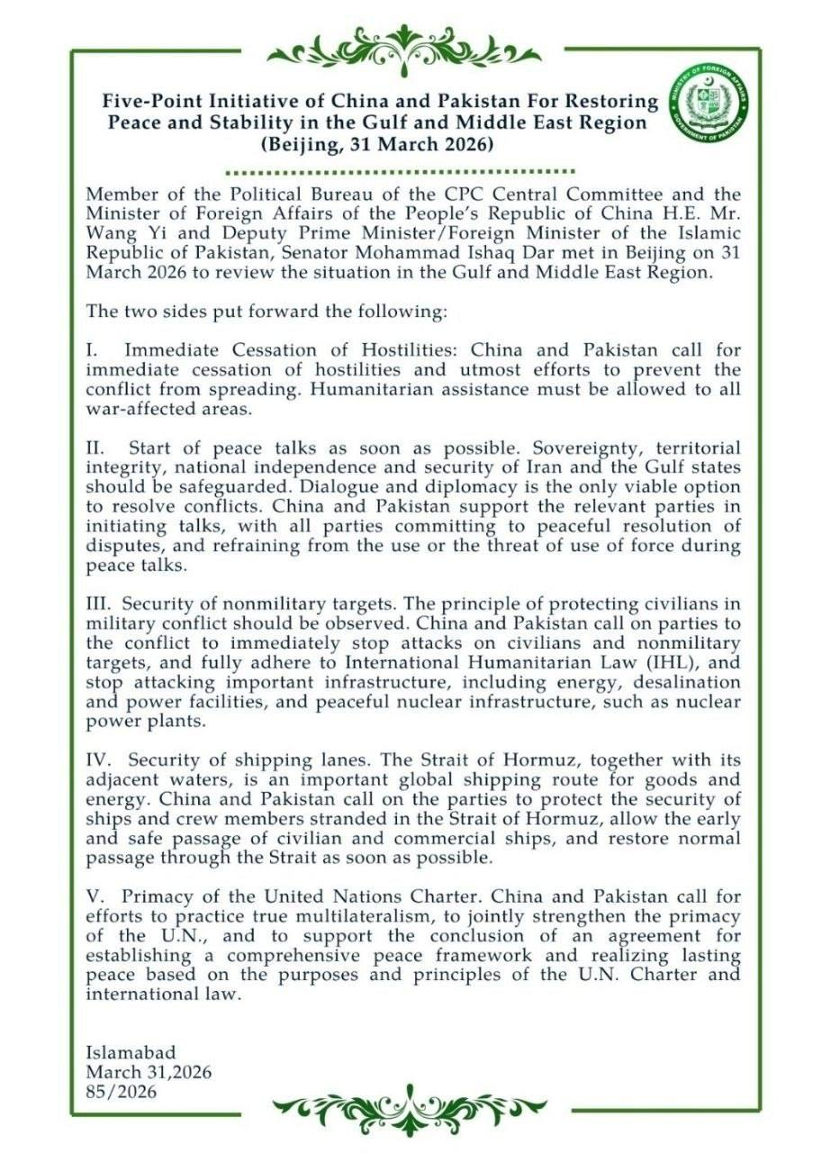جناب آقای وانگ یی، عضو دفتر سیاسی کمیتهٔ مرکزی حزب کمونیست چین و وزیر امور خارجهٔ جمهوری خلق چین، و سناتور محمد اسحاق دار، معاون نخستوزیر/وزیر امور خارجه جمهوری اسلامی پاکستان، در تاریخ ۳۱ مارس ۲۰۲۶ [۱۱ فروردین ۱۴۰۵] در پکن دیدار و گفتوگو کردند تا اوضاع منطقهٔ خلیج [فارس] و غرب آسیا (خاورمیانه) را بررسی کنند.