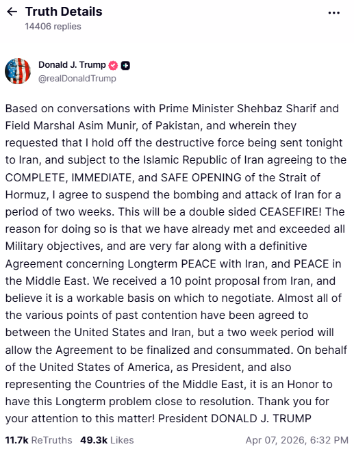 بر اساس گفتگوهایی که با شهباز شریف، نخستوزیر پاکستان، و فیلد مارشال عاصم منیر، فرمانده ارتش آن کشور، داشتم و با توجه به درخواست آنها مبنی بر اینکه از اعمال نیروی ویرانگری را که قرار بود امشب بهسوی ایران وارد شود دست نگه دارم، و مشروط به موافقت جمهوری اسلامی ایران با بازگشایی کامل، فوری، و ایمن تنگهٔ هرمز، من با تعلیق بمباران و حمله به ایران به مدت دو هفته موافقت میکنم.