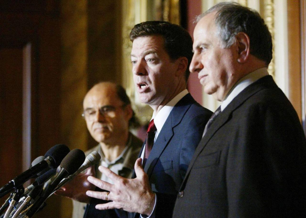 نشست خبری در کنگرهٔ آمریکا، ۲ اکتبر ۲۰۰۲. از راست به چپ، احمد چلبی، سم براونبک (نمایندهٔ جمهوریخواه آمریکایی)، و کنعان مکیه دربارهٔ آزادی عراق از طریق حملهٔ نظامی و آیندهٔ دموکراتیک پس از صدام سخن میگویند. عکس از Zuma Press.