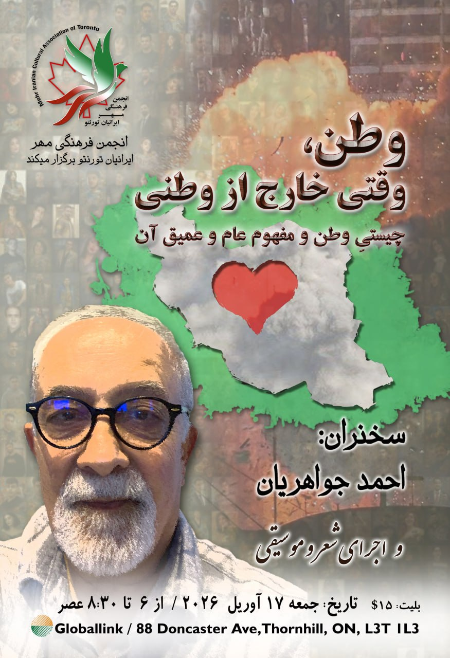 روز جمعه ۲۸ فروردین، ۱۷ آوریل ۲۰۲۶، احمد جواهریان در نشست ماهانهٔ انجمن فرهنگی مهر در تورنتو صحبت کرد. عنوان صحبت او «وطن، وقتی از وطن خارجی» با عنوان فرعی «چیستی وطن و مفهوم عام و عمیق آن» بود.