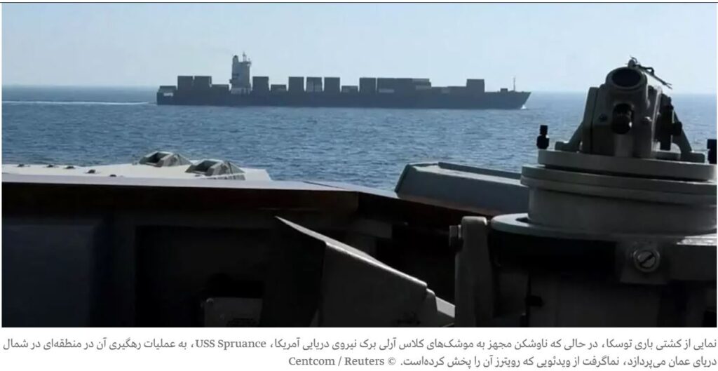 پیشتر، دونالد ترامپ اعلام کرده بود که نیروی دریایی آمریکا به کشتی ایرانی «توسکا» در آبهای عمان شلیک کرده و کنترل آن را در دست گرفتهاست. رئیس جمهوری آمریکا در شبکۀ اجتماعی خود تروث سوشیال، نوشت: «این کشتی تلاش کرد محاصره دریایی ما را بشکند و بهای آن را پرداخت».