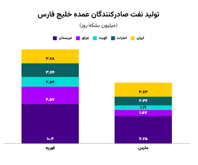 بنا بر آمارهای رسمی آژانس بینالمللی انرژی، انسداد تنگهٔ هرمز از جانب جمهوری اسلامی ایران به اُفت چشمگیر تولید و صادرات کشورهای عرب حوزهٔ خلیج فارس منجر شده است، بهطوری که تولید روزانهٔ نفت جهان در ماه گذشتهٔ میلادی با کاهش بیسابقهٔ ۱۰٫۱میلیون بشکهیی مواجه شد. علاوه بر سقوط صادرات نفت منطقه، صادرات گاز مایع (LNG) قطر نیز از ابتدای ماه مارس (۱۰ اسفند ۱۴۰۴) بهطور کامل متوقف شده است. قطر در سال گذشته با متوسط صدور ماهانهٔ ۱۰میلیارد مترمکعب گاز تأمینکنندهٔ یکپنجم مصرف جهانی بود.