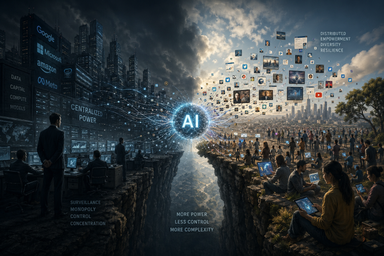 در سالهای اخیر بحث دربارهٔ هوش مصنوعی اغلب میان دو قطب در نوسان بوده است. یک روایت بر تمرکز قدرت تأکید میکند، به این معنا که شرکتهای بزرگ فناوری با دسترسی انحصاری به داده، زیرساخت، و سرمایه در حال ساختن نوعی الیگارشی دیجیتالاند. روایت دیگر از دموکراتیک شدن تواناییها میگوید: ابزارهایی که تا دیروز در اختیار صاحبان ثروت و نفوذ و امتیاز بود امروز به دست میلیونها کاربر رسیده است.